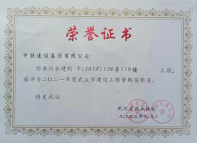二〇二一年度武漢市建設(shè)工程黃鶴獎(jiǎng)銀獎(jiǎng)-P(2018)136號(hào)11#樓工程