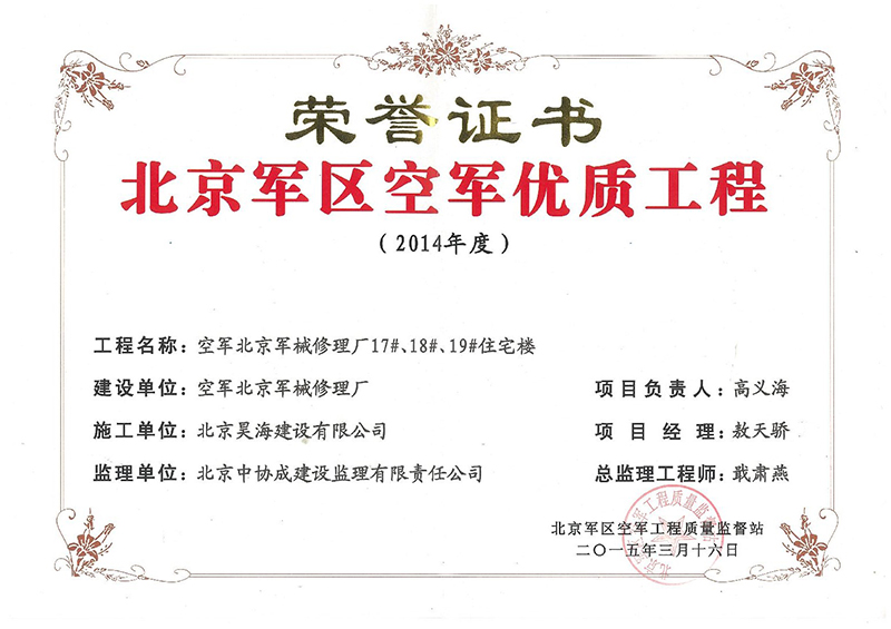 2014北空軍械廠北京空軍優(yōu)質(zhì)工程獎(jiǎng)