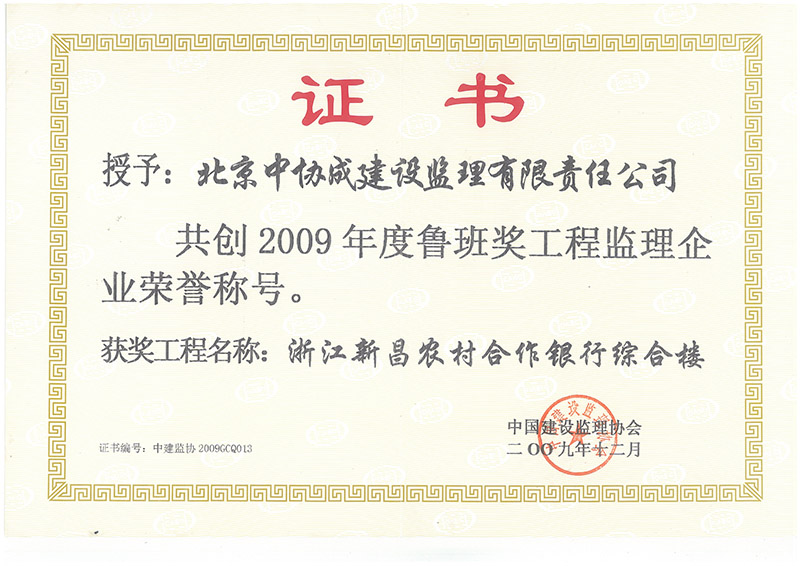 09年魯班獎證書-浙江新昌農村合作銀行綜合樓