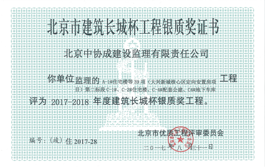 2017-2018大興安置房第二標(biāo)段C-1#、C-2#住宅樓、C-4#地下車庫(kù)建筑長(zhǎng)城杯銀質(zhì)獎(jiǎng)