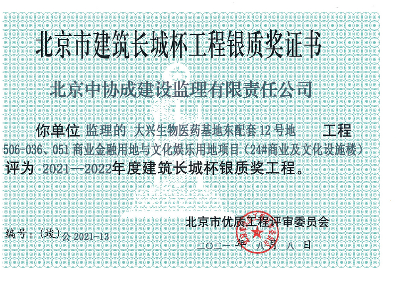 2021-2022年度建筑長(zhǎng)城杯銀質(zhì)獎(jiǎng)-大興生物醫(yī)藥基地東配套12號(hào)地商業(yè)金融用地與文化娛樂(lè)用地(24號(hào)商業(yè)及文化設(shè)施樓)