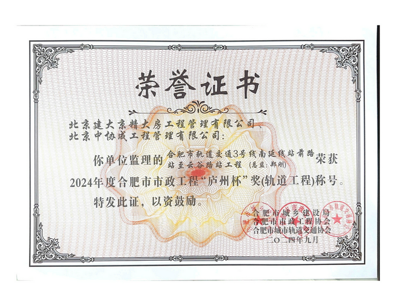 2024年度合肥市市政王程廬州杯獎(jiǎng)(軌道工程)-合肥市軌道交通3號(hào)線南延線站前路站至云谷路站工程